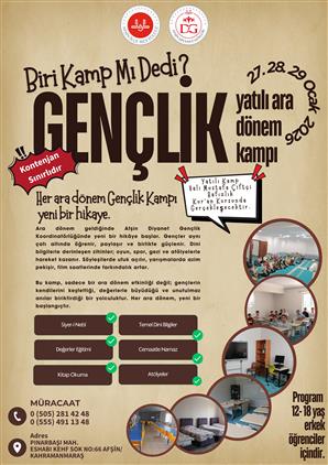 Afşin Müftülüğü, gençlerin ara tatil dönemini verimli, bilinçli ve değer odaklı bir şekilde değerlendirmelerine katkı sağlamak amacıyla Gençlik Kampı düzenliyor. Afşin Diyanet Gençlik Koordinatörlüğü organizasyonunda gerçekleştirilecek kamp, 27-28-29 Ocak 2025 tarihlerinde yatılı olarak yapılacak.