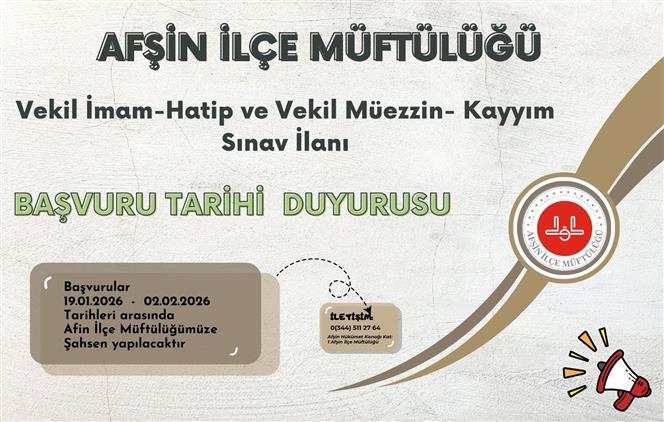 Sınav, 03.02.2026 Salı günü 09:00-17:00 saatleri arasında Afşin İlçe Müftülüğünde yapılacak