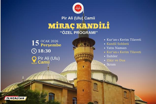 Miraç Kandili münasebetiyle Pir Ali (Ulu) Camii’nde Müftülüğümüz koordinesinde özel bir program düzenlenecektir. 15 Ocak 2026 Perşembe günü saat 18.30’da başlayacak programa tüm vatandaşlarımız davetlidir.